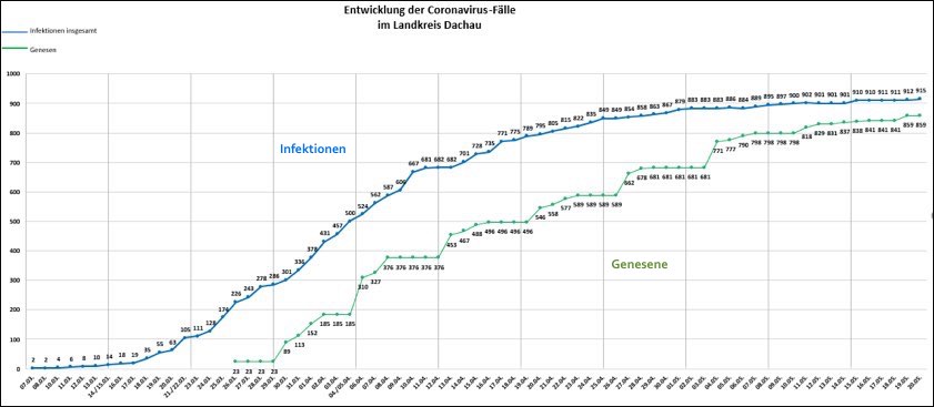 (ty) Die Zahl der bestätigten Corona-Fälle hat sich im Landkreis Dachau am heutigen Mittwoch um drei erhöht und beträgt damit nun – Stand heute, 17 Uhr – insgesamt 915. Davon waren bis gestern bereits 859 Betroffene wieder aus der Quarantäne entlassen worden, sie gelten damit als genesen. 27 Landkreis-Bürger, die positiv auf das neuartige Virus getestet worden waren, sind gestorben. Diese Daten wurde heute aus dem Landratsamt mitgeteilt. Die Grafik unten zeigt die Entwicklung der Gesamtzahl von Infektionen sowie die Entwicklung der Zahl der Genesenen.