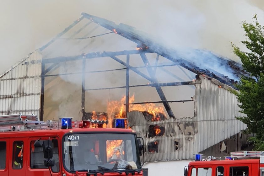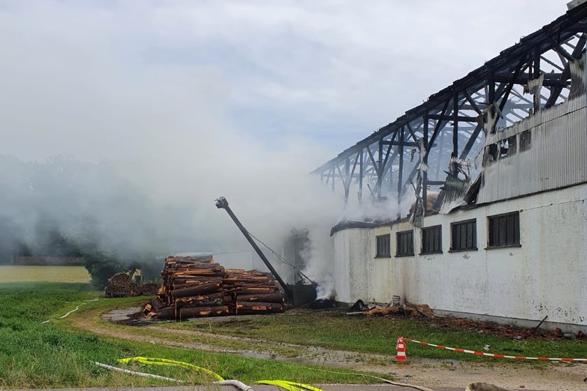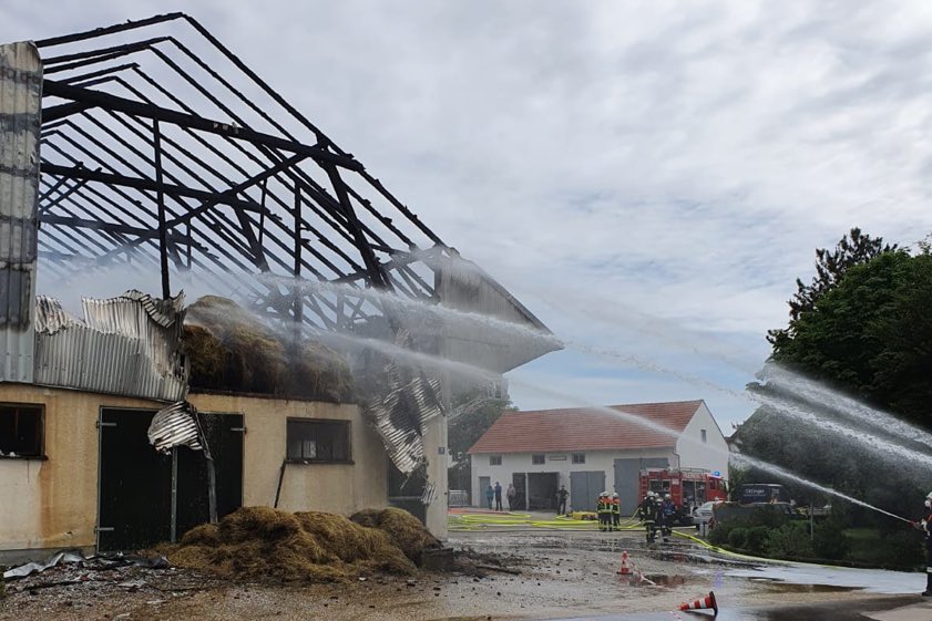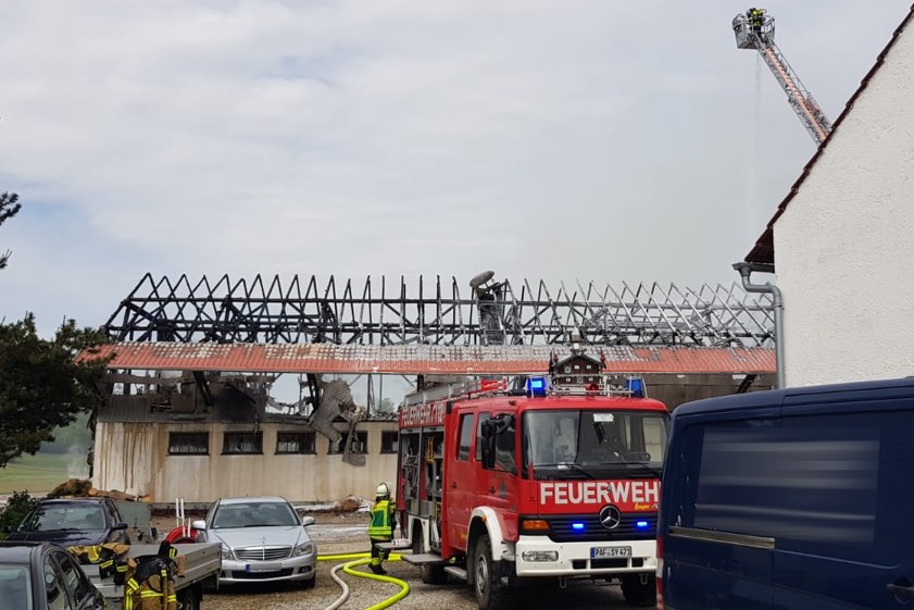Gegen 11 Uhr waren die Einsatzkräfte wegen des Brandes alarmiert worden. Das Feuer breitete sich nach Angaben des Polizeipräsidiums Oberbayern-Nord schnell in dem gesamten Gebäude aus. In der Scheune seien kurz zuvor Instandsetzungs-Arbeiten vorgenommen worden. Den ersten Ermittlungen zufolge sei durch dabei entstandenen Funkenflug in der Scheune gelagertes Heu entzündet worden. Das Gebäude wurde vollständig zum Raub der Flammen.
