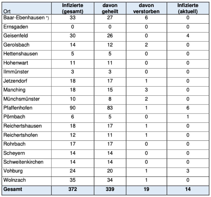 Jeweils wie viele Menschen aus welcher der insgesamt 19 Landkreis-Gemeinden bislang positiv auf das Corona-Virus getestet worden sind, können Sie der tabellarischen Aufstellung in diesem Beitrag entnehmen, die auch heute wieder vom Pfaffenhofener Landratsamt herausgegeben worden ist. "Aufgrund der mittlerweile erhöhten Zahl der Infektionen ist ein unmittelbarer Zusammenhang zu einzelnen infizierten Personen nicht mehr herstellbar", hatte die Behörde dazu erklärt. "Die Persönlichkeitsrechte der Betroffenen sind daher weiterhin geschützt."