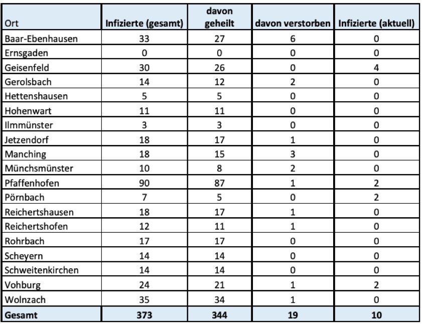 Jeweils wie viele Menschen aus welcher der insgesamt 19 Landkreis-Gemeinden bislang positiv auf das Corona-Virus getestet worden sind, können Sie der tabellarischen Aufstellung in diesem Beitrag entnehmen, die auch heute wieder vom Pfaffenhofener Landratsamt herausgegeben worden ist. "Aufgrund der mittlerweile erhöhten Zahl der Infektionen ist ein unmittelbarer Zusammenhang zu einzelnen infizierten Personen nicht mehr herstellbar", hatte die Behörde dazu erklärt. "Die Persönlichkeitsrechte der Betroffenen sind daher weiterhin geschützt."
