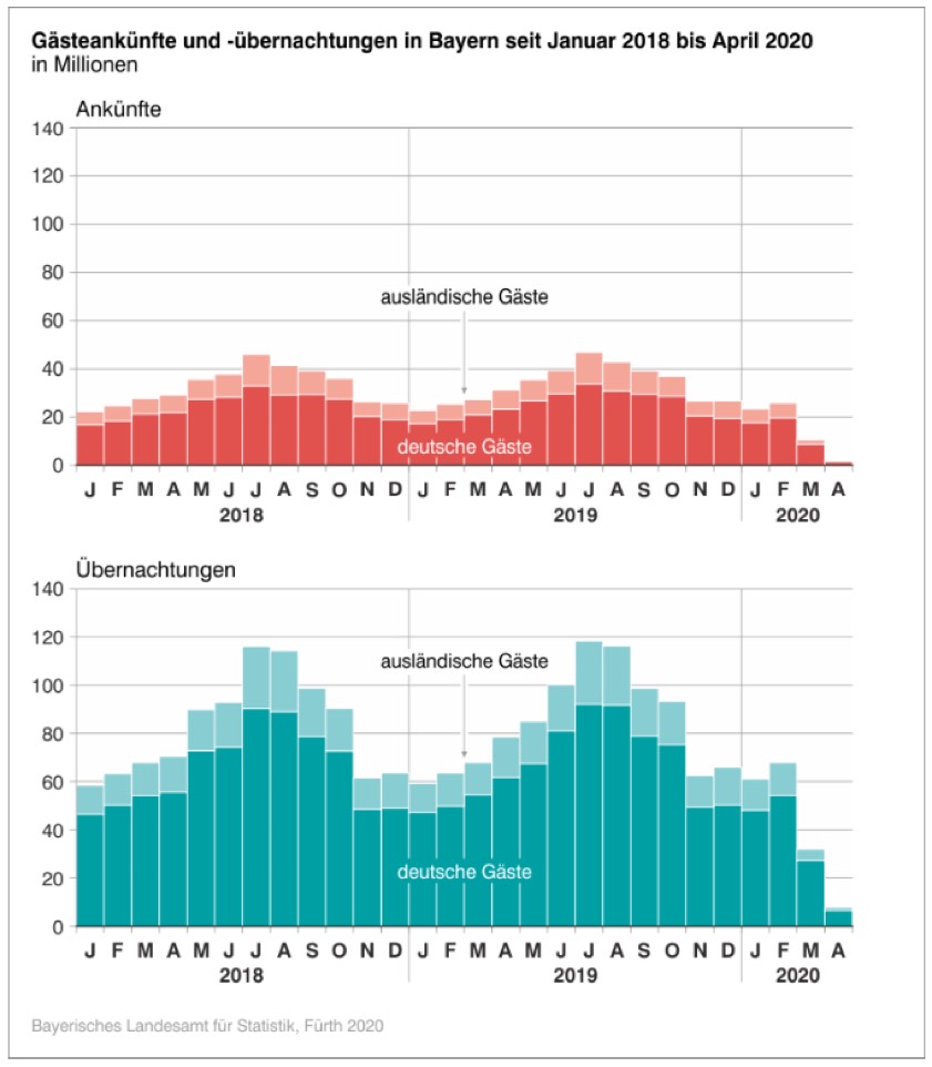 Nachdem aufgrund der Corona-Pandemie ab Mitte März Übernachtungs-Angebote nur noch für notwendige, nicht touristische Zwecke erlaubt waren und zudem weiterhin die Einreise nach Deutschland stark eingeschränkt war, hatten im April fast die Hälfte (46,5 Prozent) der insgesamt 12 034 Beherbergungs-Betriebe ihre Türen geschlossen. Die Beschränkung auf die geschäftliche Unterbringung wurde erst ab dem 30. Mai in Bayern wieder aufgehoben, sodass auch für Mai noch mit keiner wesentlichen Besserung der Ergebnisse zu rechnen ist. Das aktuell bis zum 31. August geltende Verbot von Großveranstaltungen wird ebenso wie die Absage des Oktoberfestes darüber hinaus Einfluss auf Bayerns Tourismus nehmen.