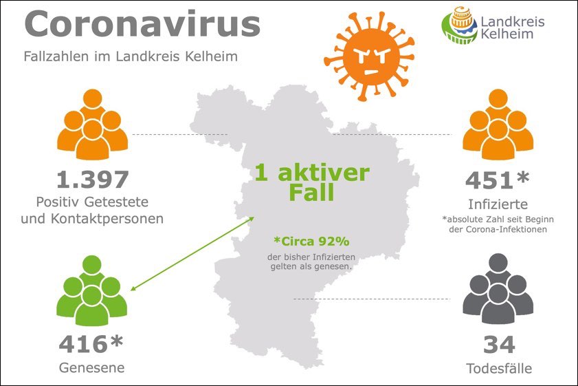 (ty) Im Kreis Kelheim gibt es, wie berichtet, in Zusammenhang mit der Corona-Pandemie bislang 34 Menschenleben zu beklagen. Die Zahl der bestätigten Corona-Fälle hat sich seit dem vergangenen Freitag um einen erhöht. Unter Verweis auf Daten des Gesundheitsamt teilte das Landratsamt mit, dass – Stand heute, 0 Uhr – die Zahl der im Kreis Kelheim positiv auf das neuartige Virus getesteten Menschen bei insgesamt 451 liegt. 416 hiesige Corona-Patienten – unverändert seit Freitag – gelten mittlerweile als genesen und sind aus der Quarantäne entlassen. Das bedeutet: Aktuell gibt es einen aktiven Corona-Fall im Landkreis, zuletzt galt der Kreis mehrere Tage lang als corona-frei.