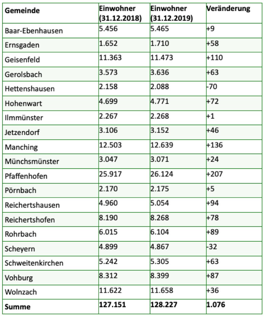Die mit Abstand größte Gemeinde im Landkreis bleibt Pfaffenhofen (26 124 Einwohner). Mit deutlichem Abstand folgen Manching (12 639), Wolnzach (11 658) und Geisenfeld (11 473). Alle weiteren Kommunen haben unter 10 000 Einwohner. Die Gemeinden mit den wenigsten Einwohnern sind Ernsgaden (1710), Hettenshausen (2088), Pörnbach (2175) und Ilmmünster (2268) – alle weiteren zählen mindestens 3000 Einwohner. Reichertshausen knackte die 5000er-Grenze. Nachfolgend alle Daten im Überblick.
