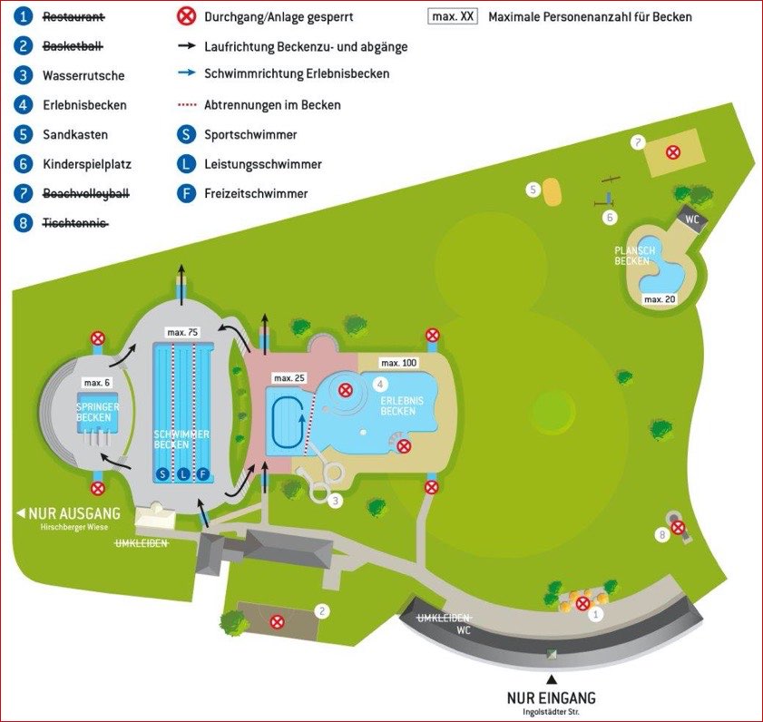 - Der Eingang in das Freibad erfolgt nur durch Zutritt an der Ingolstädter Straße, der Ausgang ist an der Hirschberger Wiese