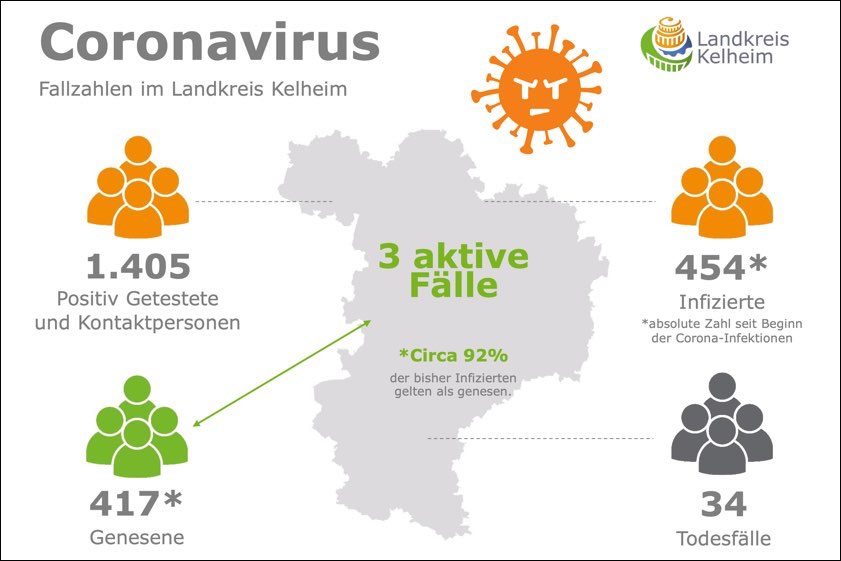 (ty) Im Kreis Kelheim gibt es, wie berichtet, in Zusammenhang mit der Corona-Pandemie bislang 34 Menschenleben zu beklagen. Die Zahl der bestätigten Corona-Fälle hat sich seit Freitag um einen erhöht. Unter Verweis auf Daten des Gesundheitsamt teilte das Landratsamt mit, dass – Stand heute, 0 Uhr – die Zahl der im Kreis Kelheim positiv auf das neuartige Virus getesteten Menschen bei insgesamt 454 liegt. 417 hiesige Corona-Patienten – einer mehr als am Freitag – gelten mittlerweile als genesen und sind aus der Quarantäne entlassen. Das bedeutet: Aktuell gibt es drei aktive Corona-Fälle im Landkreis.