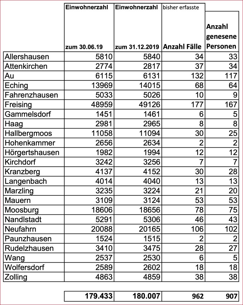 (ty) Einmal wöchentlich veröffentlicht das Landratsamt die aktuellen Corona-Fallzahlen aus dem Kreis Freising nach Gemeinden aufgeschlüsselt. So auch heute wieder. Den Angaben zufolge sind bislang – Stand: gestern, 14 Uhr – insgesamt 968 Personen positiv auf den neuartigen Erreger getestet worden. 907 der Betroffenen gelten mittlerweile als genesen, 42 Infizierte sind gestorben. Der unten stehenden Tabelle ist zu entnehmen, wie viele Personen positiv auf Corona getestet worden sind und wie viele als genesen zählen. Hinweis der Behörde: "Die Summe entspricht nicht der aktuellen Gesamtzahl für den Landkreis."