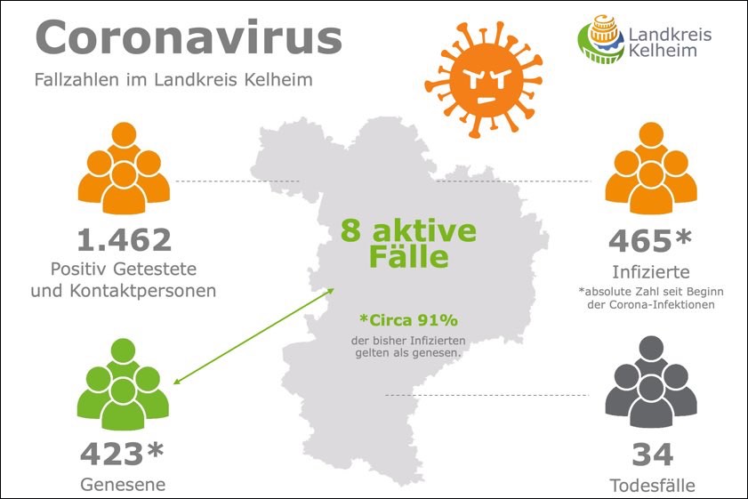 (ty) Im Kreis Kelheim gibt es, wie berichtet, in Zusammenhang mit der Corona-Pandemie bislang 34 Menschenleben zu beklagen. Die Zahl der bestätigten Corona-Fälle hat sich seit gestern nicht erhöht. Unter Verweis auf Daten des Gesundheitsamt teilte das Landratsamt mit, dass – Stand heute, 0 Uhr – die Zahl der im Kreis Kelheim positiv auf das neuartige Virus getesteten Menschen bei insgesamt 465 liegt. 423 hiesige Corona-Patienten – ebenfalls unverändert seit gestern – gelten mittlerweile als genesen und sind aus der Quarantäne entlassen. Das bedeutet: Weiterhin gibt es acht aktive Corona-Fälle im Landkreis.