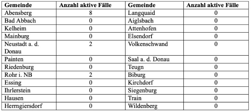 (ty) Im Kreis Kelheim gibt es, wie berichtet, in Zusammenhang mit der Corona-Pandemie bislang 34 Menschenleben zu beklagen. Die Zahl der bestätigten Corona-Fälle hat sich seit gestern um einen erhöht. Unter Verweis auf Daten des Gesundheitsamts teilte das Landratsamt mit, dass – Stand heute, 0 Uhr – die Zahl der im Kreis Kelheim positiv auf das neuartige Virus getesteten Menschen bei insgesamt 472 liegt. 426 hiesige Corona-Patienten – unverändert seit gestern – gelten mittlerweile als genesen und sind aus der Quarantäne entlassen. Das bedeutet: Aktuell gibt es zwölf aktive Corona-Fälle im Landkreis. Zahlen aus den Gemeinden zeigt die Tabelle unten.