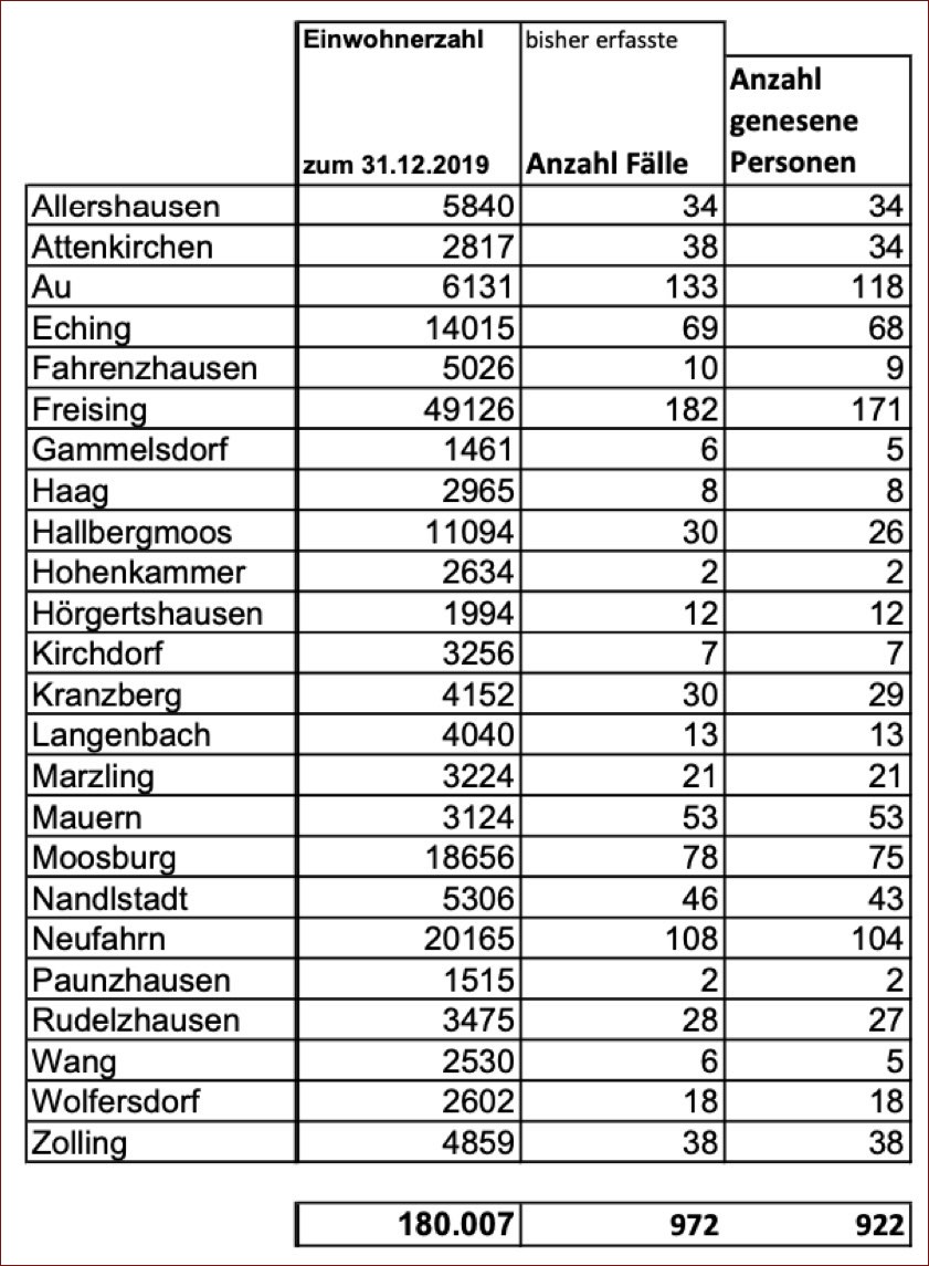 (ty) Einmal wöchentlich veröffentlicht das Landratsamt von Freising die hiesigen Fallzahlen zum Corona-Virus auf die Gemeinden aufgeschlüsselt. Der heute herausgegebenen, unten stehenden Tabelle ist zu entnehmen, wie viele Personen bislang positiv auf den neuartigen Erreger getestet worden sind und wie viele davon mittlerweile als genesen gelten. Hinweis der Behörde: "Die Summe entspricht nicht der aktuellen Gesamtzahl für den Landkreis." Zum jüngsten Stand (heute, 12 Uhr), gab es im Kreis Freising 982 bestätigte Corona-Fälle. 922 Betroffene gelten als genesen, 42 Infizierte sind gestorben.