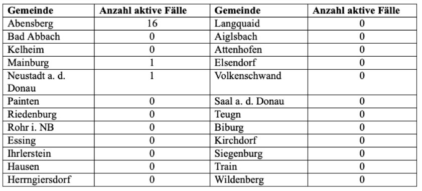 (ty) Im Kreis Kelheim gibt es, wie berichtet, in Zusammenhang mit der Corona-Pandemie bislang 34 Menschenleben zu beklagen. Die Zahl der bestätigten Corona-Fälle hat sich seit Freitag um insgesamt fünf erhöht. Unter Verweis auf Daten des Gesundheitsamts teilte das Landratsamt mit, dass – Stand heute, 0 Uhr – die Zahl der im Kreis Kelheim positiv auf das neuartige Virus getesteten Menschen bei insgesamt 483 liegt. 431 hiesige Corona-Patienten – einer mehr als am Freitag – gelten mittlerweile als genesen und sind aus der Quarantäne entlassen. Das bedeutet: Aktuell gibt es 18 aktive Corona-Fälle im Landkreis. Zahlen aus den Gemeinden zeigt die Tabelle unten.