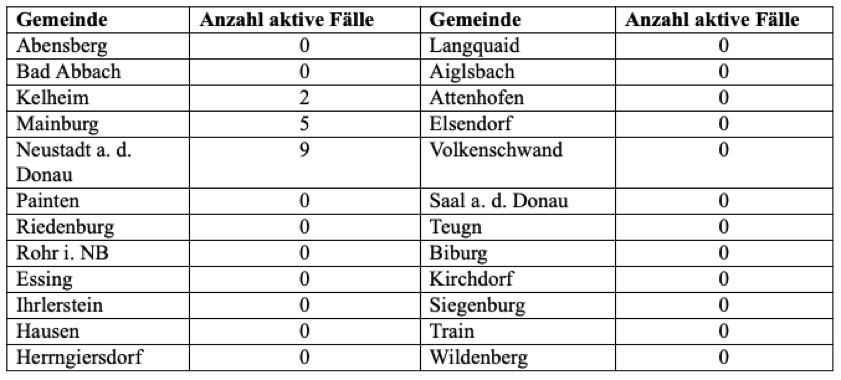 Das Landratsamt wies heute einmal mehr darauf hin, "dass es trotz Auftreten von einzelnen aktiven Fällen in den Landkreis-Gemeinden laut Gesundheitsamt aktuell keine bedeutsame Häufung von Fallzahlen im Landkreis Kelheim gibt".