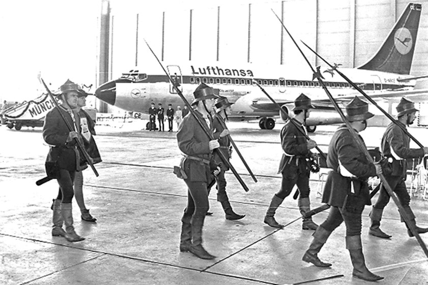 (ty) Es war ein großer Festakt am Flughafen München-Riem: Vor genau 50 Jahren, am 7. August 1970, wurde ein Lufthansa-Jet vom Typ "Boeing 737-200" auf den Namen "Landshut" getauft. Zur feierlichen Taufzeremonie war eigens eine 100-köpfige Delegation aus der Herzogstadt angereist. Eine Musikkapelle spielte auf, Landsknechte, Edeldamen und Fahnenschwinger in historischen Kostümen begrüßten das Flugzeug (Foto unten), das den Namen der niederbayerischen Stadt in alle Welt tragen sollte.