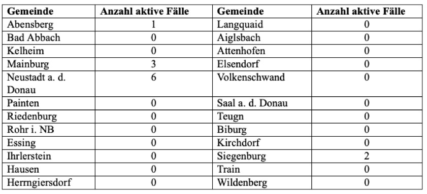 Das Landratsamt wies heute einmal mehr darauf hin, "dass es trotz Auftreten von einzelnen aktiven Fällen in den Landkreis-Gemeinden laut Gesundheitsamt aktuell keine bedeutsame Häufung von Fallzahlen im Landkreis Kelheim gibt".