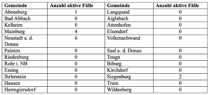 Das Landratsamt wies heute einmal mehr darauf hin, "dass es trotz Auftreten von einzelnen aktiven Fällen in den Landkreis-Gemeinden laut Gesundheitsamt aktuell keine bedeutsame Häufung von Fallzahlen im Landkreis Kelheim gibt".