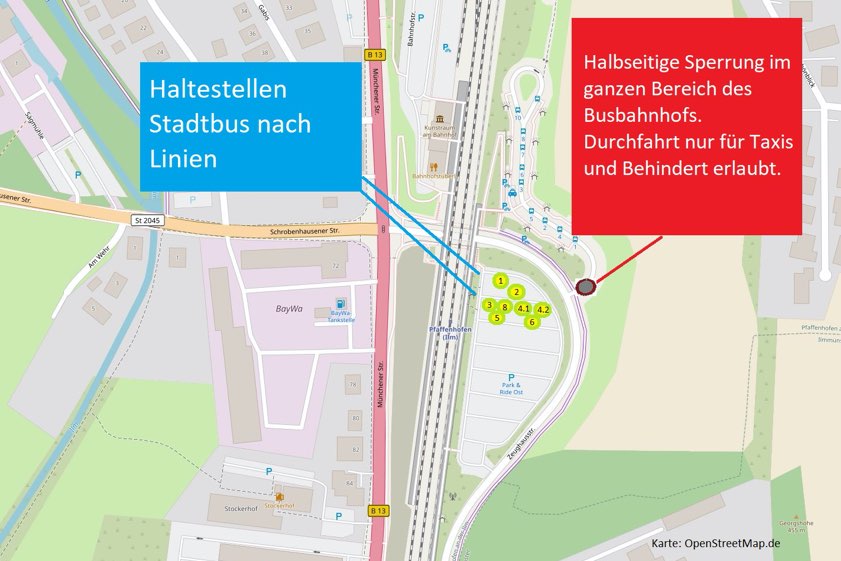 (ty) Am kommenden Montag, 17. August, beginnen die Tiefbau-Arbeiten der Deutschen Bahn im Bereich des Busbahnhofs der Stadt Pfaffenhofen. Das wurde heute aus dem Rathaus gemeldet. Den Angaben zufolge wird der gesamte Stadtbus-Verkehr – voraussichtlich bis 11. September – auf den südlichen Pendler-Parkplatz verlagert. "Alle Stadtbus-Linien halten in dieser Zeit auf dem Parkplatz", heißt es weiter. Zur Orientierung dienen ein Lageplan (siehe unten) und die Beschilderung vor Ort.