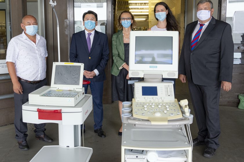 "Vom dortigen Gesundheits-Ministerium werden die Geräte an die umliegenden Kliniken verteilt", heißt es aus dem Ingolstädter Klinikum. "Wir freuen uns sehr, dass die Geräte in gute Hände kommen und noch sinnvoll weiterverwendet werden", sagt Monika Röther, kaufmännische Geschäftsführerin des Klinikums (Mitte). Tegshjargal Demchig (Zweiter von links), gesandter Botschaftsrat der mongolischen Botschaft in Berlin, zeigte sich sehr dankbar über die Spende.