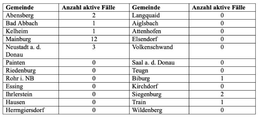 Das Landratsamt wies auch heute per Pressemitteilung darauf hin, "dass es trotz Auftreten von einzelnen aktiven Fällen in den Landkreis-Gemeinden laut Gesundheitsamt aktuell keine bedeutsame Häufung von Fallzahlen im Landkreis Kelheim gibt".