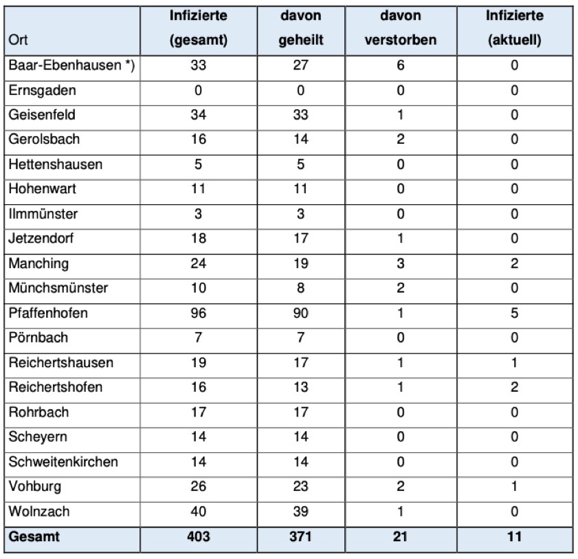 Jeweils wie viele Menschen aus welcher der insgesamt 19 Landkreis-Gemeinden bislang positiv auf das Corona-Virus getestet worden sind, können Sie der tabellarischen Aufstellung in diesem Beitrag entnehmen, die auch heute wieder vom Pfaffenhofener Landratsamt herausgegeben worden ist.