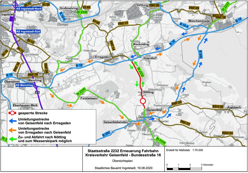 (ty) Voraussichtlich ab dem kommenden Montag, 24. August, erneuert das staatliche Bauamt Ingolstadt unter mehrwöchiger Vollsperrung die Fahrbahn der Staatsstraße 2232 zwischen Geisenfeld – Kreisverkehr am Ortsausgang in Richtung Nötting – und der Bundesstraße B16. Das wurde heute von der Behörde gemeldet. Die Ortschaft Nötting sei von Geisenfeld aus erreichbar. Die Umleitungen (siehe Karte unten) seien örtlich beschildert. Die Arbeiten sollen Mitte des kommenden Monats abgeschlossen sein, wie es heißt.