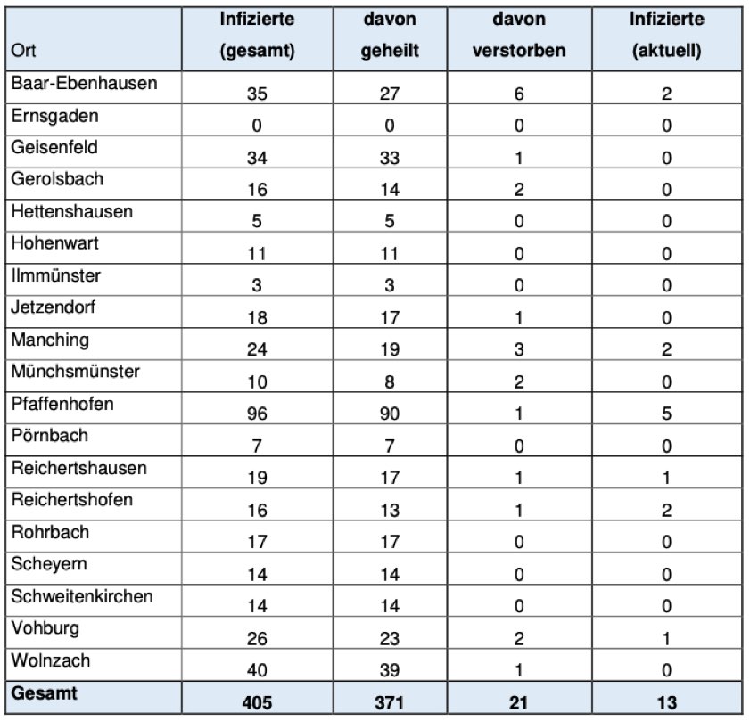 (ty) Im Zusammenhang mit der Corona-Pandemie gibt es im Kreis Pfaffenhofen, wie berichtet, bislang 21 Menschenleben zu beklagen. Das Landratsamt veröffentlicht seit einiger Zeit eine tägliche Übersicht (siehe unten) darüber, in welchen Gemeinden die mit dem Virus infizierten Menschen, die gestorben sind, gelebt haben beziehungsweise wie viele bestätigte Infektionsfälle und genesene Patienten es in welcher Kommune gibt. Die Zahl der Landkreis-Bürger, die positiv auf den neuartigen Erreger getestet worden sind, hat sich seit gestern um zwei erhöht und beträgt jetzt 405.