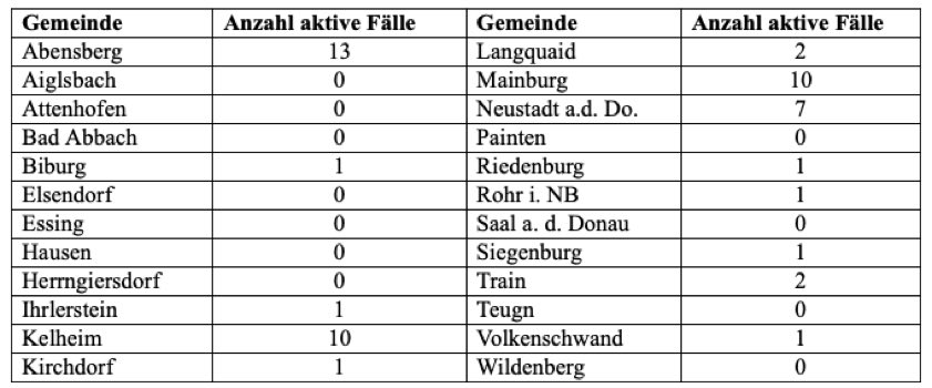 Das Landratsamt weist trotz der jüngsten Entwicklung auch heute in einer Pressemitteilung wieder darauf hin, "dass es trotz Auftreten von einzelnen aktiven Fällen in den Landkreis-Gemeinden laut Gesundheitsamt aktuell keine bedeutsame Häufung von Fallzahlen im Landkreis Kelheim gibt".
