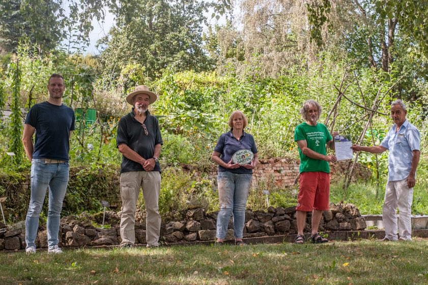 (ty) Im Rahmen einer Garten-Besichtigung durch die Landschafts-Architektin und Pflanzen-Botschafterin der Deutschen Gartenbau-Gesellschaft, Dorle Engels, ist dem bereits mehrfach prämierten und gewürdigten Inter-Kultur-Garten (IKG) von Pfaffenhofen nun auch die die Auszeichnung "Natur im Garten" mittels Plakette und Urkunde verliehen worden. Diese Auszeichnung sei für Gärten, die zahlreiche Kriterien einhalten, berichten die Verantwortlichen des Pfaffenhofener Inter-Kultur-Gartens. Sie habe ihren Ursprung in Österreich und werde in Deutschland vom "Verband Wohneigentum" betreut und vergeben.