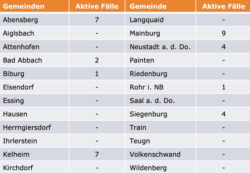 (ty) Im Kreis Kelheim gibt es, wie berichtet, in Zusammenhang mit der Corona-Pandemie bislang 34 Menschenleben zu beklagen. Die Zahl der bestätigten Corona-Fälle hat sich seit Freitag um 13 erhöht. Unter Verweis auf Daten des Gesundheitsamts teilte das Landratsamt heute mit, dass – Stand gestern, 16 Uhr – die Zahl der im Kreis Kelheim positiv auf das neuartige Virus getesteten Menschen bei insgesamt 609 liegt. 540 hiesige Corona-Patienten – 28 mehr als am Freitag – gelten mittlerweile als genesen und sind aus der Quarantäne entlassen. Das bedeutet: Derzeit gibt es 35 aktive Corona-Fälle im Landkreis. Zahlen aus den Gemeinden zeigt die Tabelle unten.