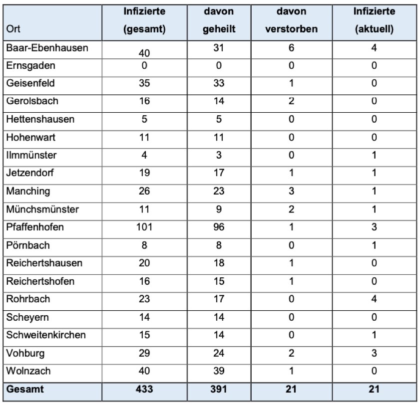 Jeweils wie viele Menschen aus welcher der insgesamt 19 Landkreis-Gemeinden bislang positiv auf das Corona-Virus getestet worden sind, können Sie der tabellarischen Aufstellung in diesem Beitrag entnehmen, die auch heute wieder vom Pfaffenhofener Landratsamt herausgegeben worden ist.