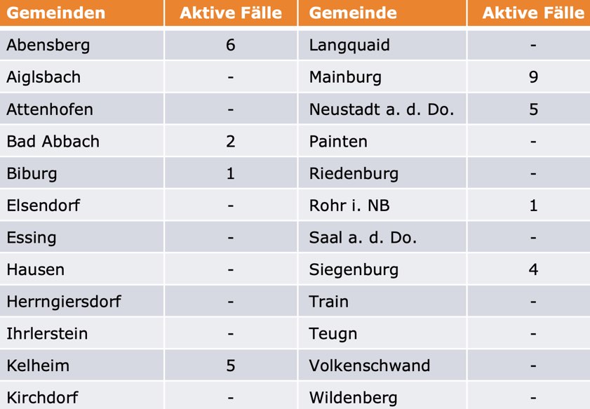 (ty) Im Kreis Kelheim gibt es, wie berichtet, in Zusammenhang mit der Corona-Pandemie bislang 34 Menschenleben zu beklagen. Die Zahl der bestätigten Corona-Fälle hat sich seit gestern um einen erhöht. Unter Verweis auf Daten des Gesundheitsamts teilte das Landratsamt heute mit, dass – Stand gestern, 16 Uhr – die Zahl der im Kreis Kelheim positiv auf das neuartige Virus getesteten Menschen bei insgesamt 610 liegt. 543 hiesige Corona-Patienten – drei mehr als gestern – gelten mittlerweile als genesen und sind aus der Quarantäne entlassen. Das bedeutet: Derzeit gibt es 33 aktive Corona-Fälle im Landkreis. Zahlen aus den Gemeinden zeigt die Tabelle unten.