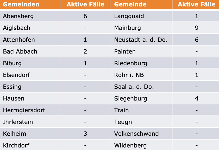 (ty) Im Kreis Kelheim gibt es, wie berichtet, in Zusammenhang mit der Corona-Pandemie bislang 34 Menschenleben zu beklagen. Die Zahl der bestätigten Corona-Fälle hat sich seit gestern um vier erhöht. Unter Verweis auf Daten des Gesundheitsamts teilte das Landratsamt heute mit, dass – Stand gestern, 16 Uhr – die Zahl der im Kreis Kelheim positiv auf das neuartige Virus getesteten Menschen bei insgesamt 614 liegt. 545 hiesige Corona-Patienten – zwei mehr als gestern – gelten mittlerweile als genesen und sind aus der Quarantäne entlassen. Das bedeutet: Derzeit gibt es 35 aktive Corona-Fälle im Landkreis. Zahlen aus den Gemeinden zeigt die Tabelle unten.