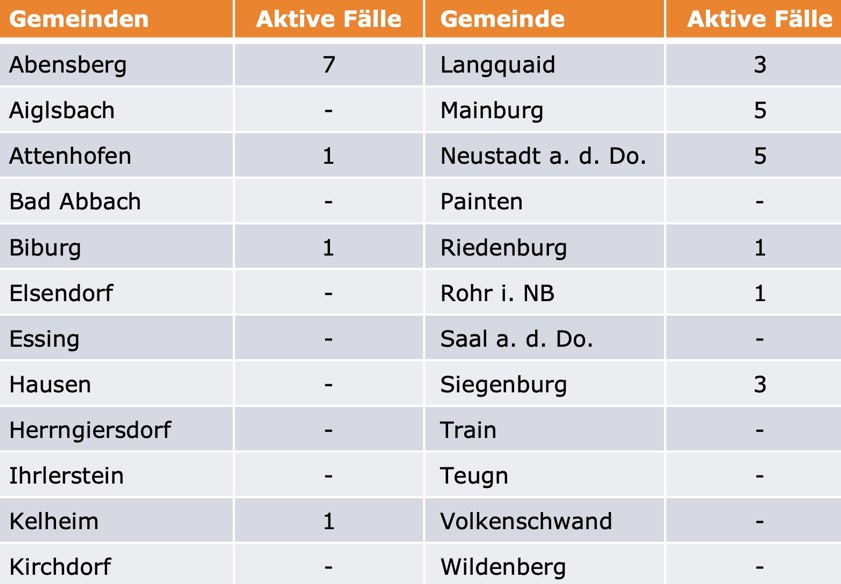 (ty) Im Kreis Kelheim gibt es, wie berichtet, in Zusammenhang mit der Corona-Pandemie bislang 34 Menschenleben zu beklagen. Die Zahl der bestätigten Corona-Fälle hat sich seit gestern um einen erhöht. Unter Verweis auf Daten des Gesundheitsamts teilte das Landratsamt heute mit, dass – Stand gestern, 16 Uhr – die Zahl der im Kreis Kelheim positiv auf das neuartige Virus getesteten Menschen bei insgesamt 619 liegt. 557 hiesige Corona-Patienten – sechs mehr als tags zuvor – gelten mittlerweile als genesen und sind aus der Quarantäne entlassen. Das bedeutet: Derzeit gibt es 28 aktive Corona-Fälle im Landkreis. Zahlen aus den Gemeinden zeigt die Tabelle unten.
