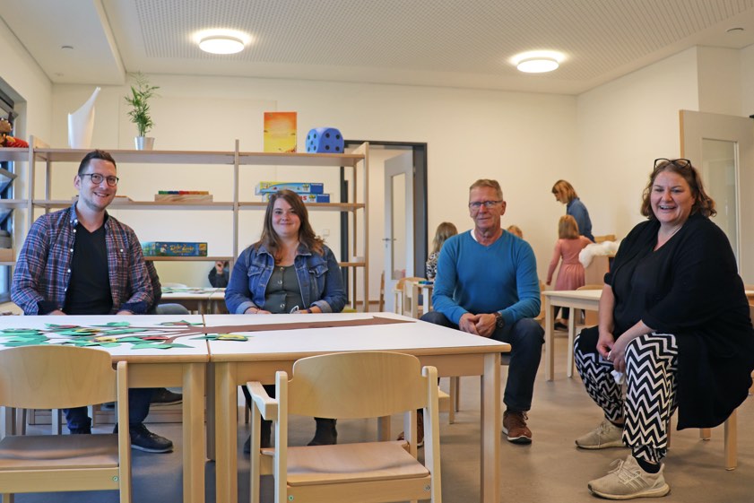 In der neuen Kita "Am Apfebaam": Daniel Riegel (von links, zuständiger Sachgebiets-Leiter im Rathaus), Kita-Leiterin Julia Wich , Vize-Bürgermeister Roland Dörfler, Kathrin Maier (zuständige Amtsleiterin im Rathaus). Fotos: Stadtverwaltung