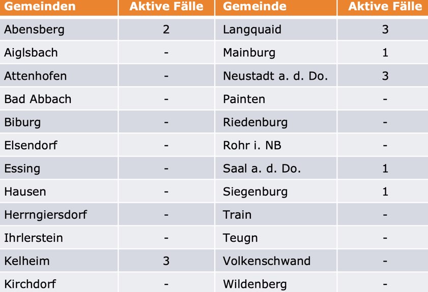 (ty) Im Kreis Kelheim gibt es, wie berichtet, in Zusammenhang mit der Corona-Pandemie bislang 34 Menschenleben zu beklagen. Die Zahl der bestätigten Corona-Fälle hat sich seit der gestrigen offiziellen Meldung um einen erhöht. Unter Verweis auf Daten des Gesundheitsamts teilte das Landratsamt heute mit, dass – Stand gestern, 16 Uhr – die Zahl der im Kreis Kelheim positiv auf das neuartige Virus getesteten Menschen bei insgesamt 627 liegt. 579 hiesige Corona-Patienten – sechs mehr als gestern gemeldet – gelten mittlerweile als genesen und sind aus der Quarantäne entlassen. Das bedeutet: Derzeit gibt es 14 aktive Corona-Fälle im Landkreis. Zahlen aus den Gemeinden zeigt die Tabelle unten.
