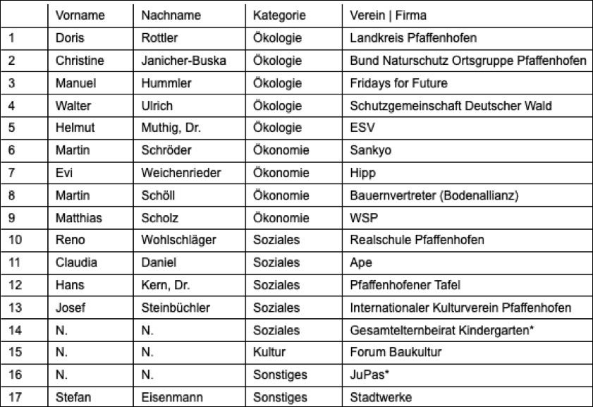 (ty) Die Zusammensetzung des in dieser Wahlperiode vom Pfaffenhofener Stadtrat neu eingeführten Nachhaltigkeits-Beirats steht jetzt weitgehend fest. Das Ratsgremium habe am Donnerstagabend im nicht-öffentlichen Teil der Sitzung die Vorschläge der Verwaltung genehmigt (siehe Liste unten). Außerdem werde die oberbayerische Kreisstadt auf dem Gebiet der Nachhaltigkeit künftig mit der Stadt Turrialba in Costa Rica zusammenarbeiten, wie aus dem Rathaus mitgeteilt wurde.