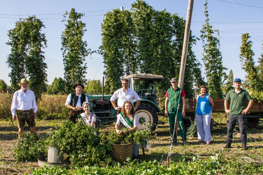 "Die beiden Hopfensorten Ariana und Hallertau Blanc haben wir im Juni 2019 gepflanzt. Seitdem sind sie rund sechs Meter gewachsen und nun zur Ernte bereit. Den Großteil des Hopfens ernten wir, wie heute üblich, maschinell mit Traktor, Anhänger und Zupfmaschine", erklärt Erich Lehmair von der Hopfen-Verwertungs-Genossenschaft. Die amtierende Hallertauer Hopfenkönigin Theresa Hagl zupfte gemeinsam mit Eva Linder, der Geschäftsführerin der Landesgartenschau Ingolstadt, einen Teil des grünen Goldes traditionell per Hand.