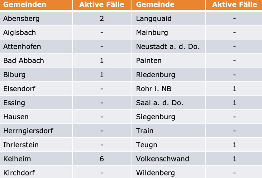 (ty) Im Kreis Kelheim gibt es, wie berichtet, in Zusammenhang mit der Corona-Pandemie bislang 34 Menschenleben zu beklagen. Die Zahl der bestätigten Corona-Fälle hat sich seit der offiziellen Meldung vom Freitag um fünf erhöht. Unter Verweis auf Daten des Gesundheitsamts teilte das Landratsamt heute mit, dass – Stand gestern, 16 Uhr – die Zahl der im Kreis Kelheim positiv auf das neuartige Virus getesteten Menschen bei insgesamt 644 liegt. 596 hiesige Corona-Patienten – acht mehr als am Freitag gemeldet – gelten mittlerweile als genesen und sind aus der Quarantäne entlassen. Das bedeutet: Derzeit gibt es 14 aktive Corona-Fälle im Landkreis. Zahlen aus den Gemeinden zeigt die Tabelle unten.