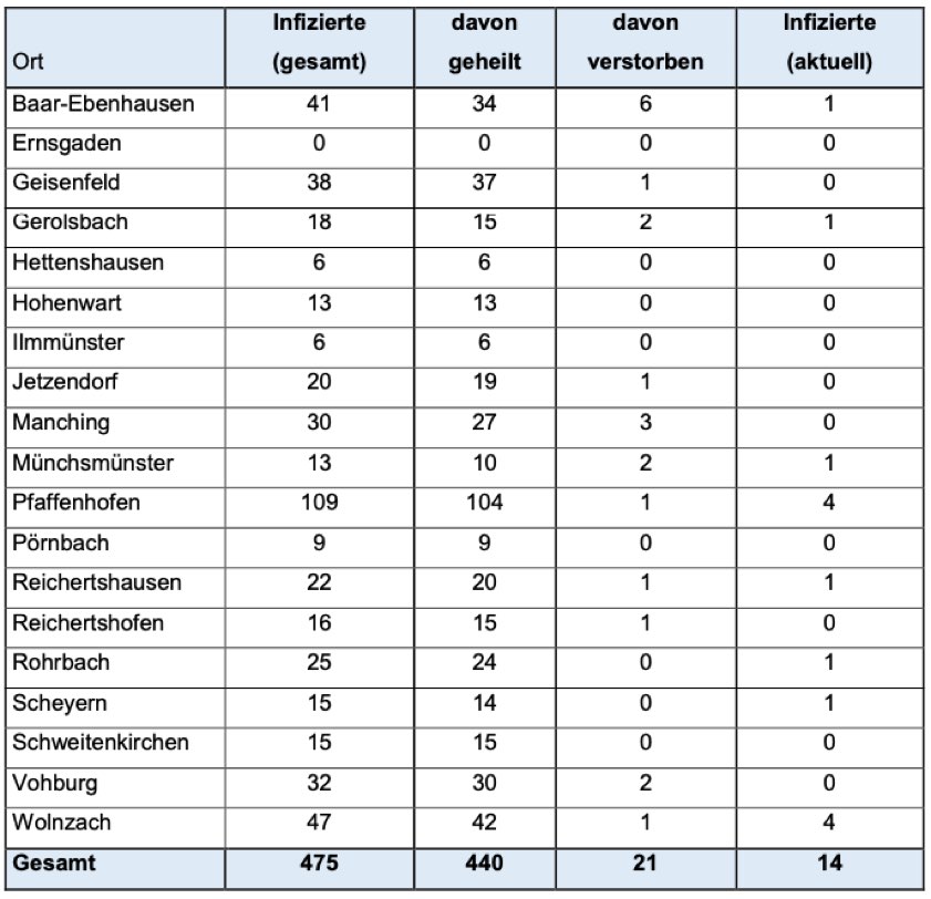 Jeweils wie viele Menschen aus welcher der insgesamt 19 Landkreis-Gemeinden bislang positiv auf das Corona-Virus getestet worden sind, können Sie der tabellarischen Aufstellung in diesem Beitrag entnehmen, die auch heute wieder vom Pfaffenhofener Landratsamt herausgegeben worden ist.