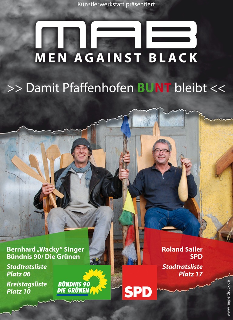 Bernhard „Wacky“ Singer von den Grünen und Roland Sailer von den Roten posieren auf ein und demselben Plakat. Aber nicht einfach so, sondern nach dem Motto „Künstlerwerkstatt präsentiert“ und unter der Überschrift: „Men against black. Damit Pfaffenhofen bunt bleibt.“ Gegen wen das Ganze geht, ist klar: gegen die Schwarzen, also die CSU. Den die Christsozialen werden offenbar als nahendes Unterwetter gesehen, jedenfalls soll das Plakat das offenbar suggerieren.