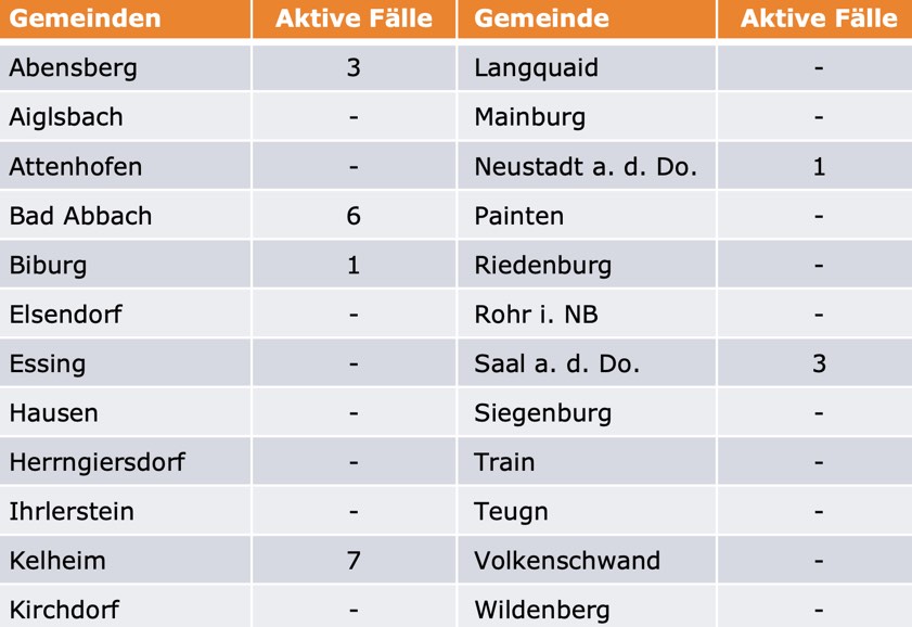 (ty) Im Kreis Kelheim gibt es, wie berichtet, in Zusammenhang mit der Corona-Pandemie bislang 34 Menschenleben zu beklagen. Die Zahl der bestätigten Corona-Fälle hat sich seit der gestrigen offiziellen Meldung um zwei erhöht. Unter Verweis auf Daten des Gesundheitsamts teilte das Landratsamt heute mit, dass – Stand gestern, 16 Uhr – die Zahl der im Kreis Kelheim positiv auf das neuartige Virus getesteten Menschen bei insgesamt 656 liegt. 601 hiesige Corona-Patienten – unverändert seit der gestrigen Meldung – gelten mittlerweile als genesen und sind aus der Quarantäne entlassen. Das bedeutet: Derzeit gibt es 21 aktive Corona-Fälle (gestern: 19) im Landkreis. Zahlen aus den Gemeinden zeigt die Tabelle unten.