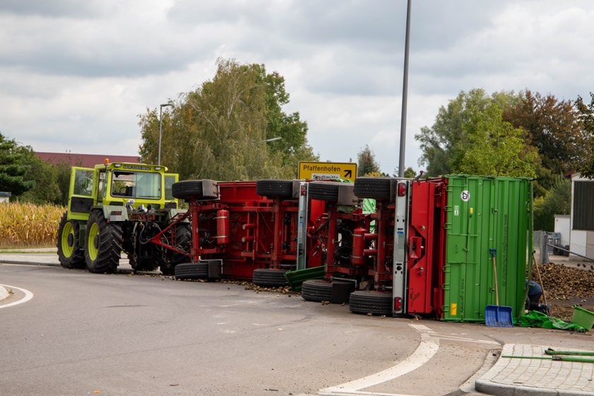 (ty) Ein 60-Jähriger aus dem Gemeinde-Bereich von Königsmoos war am frühen gestrigen Nachmittag mit seinem Traktor samt zwei Anhängern, beladen mit Erdäpfeln, von Langenmosen her kommend in Richtung Schrobenhausen unterwegs, als die Tour ein jähes Ende finden sollte. Am so genannten Kartoffel-Kreisel wollte er gegen 13 Uhr von der Neuburger Straße in die Straße "Rainerau" steuern. Dabei gerieten die beiden Anhänger laut Polizei nach rechts von der Strecke ab und stürzten um.