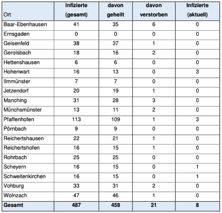 (ty) Im Zusammenhang mit der Corona-Pandemie gibt es im Kreis Pfaffenhofen, wie berichtet, bislang 21 Menschenleben zu beklagen. Das Landratsamt veröffentlicht seit einiger Zeit eine tägliche Übersicht (siehe unten) darüber, in welchen Gemeinden die mit dem Virus infizierten Menschen, die gestorben sind, gelebt haben beziehungsweise wie viele bestätigte Infektionsfälle und genesene Patienten es in welcher Kommune gibt. Die Zahl der Landkreis-Bürger, die positiv auf den neuartigen Erreger getestet worden sind, hat sich seit gestern nicht erhöht und beträgt damit weiterhin 487.