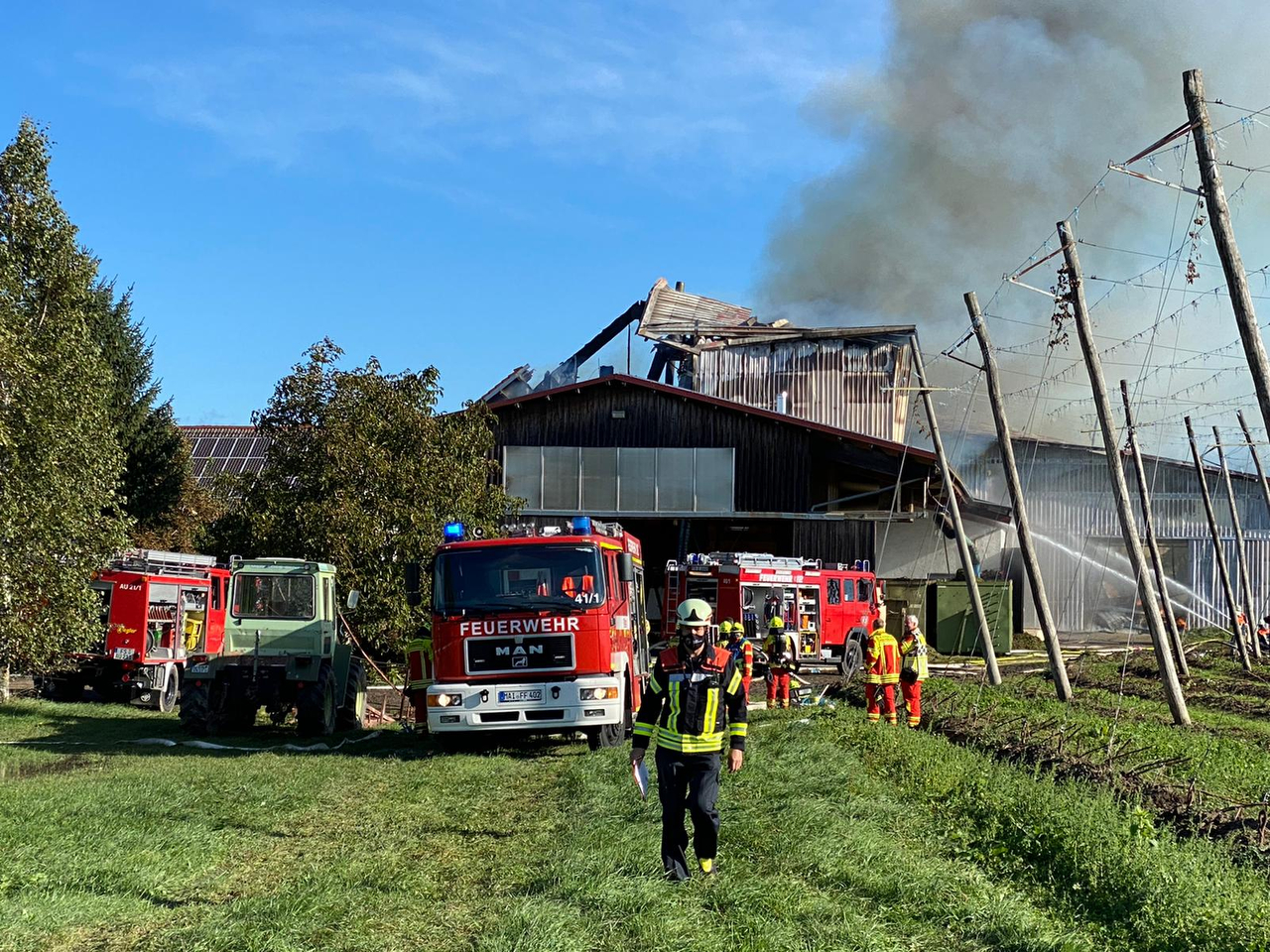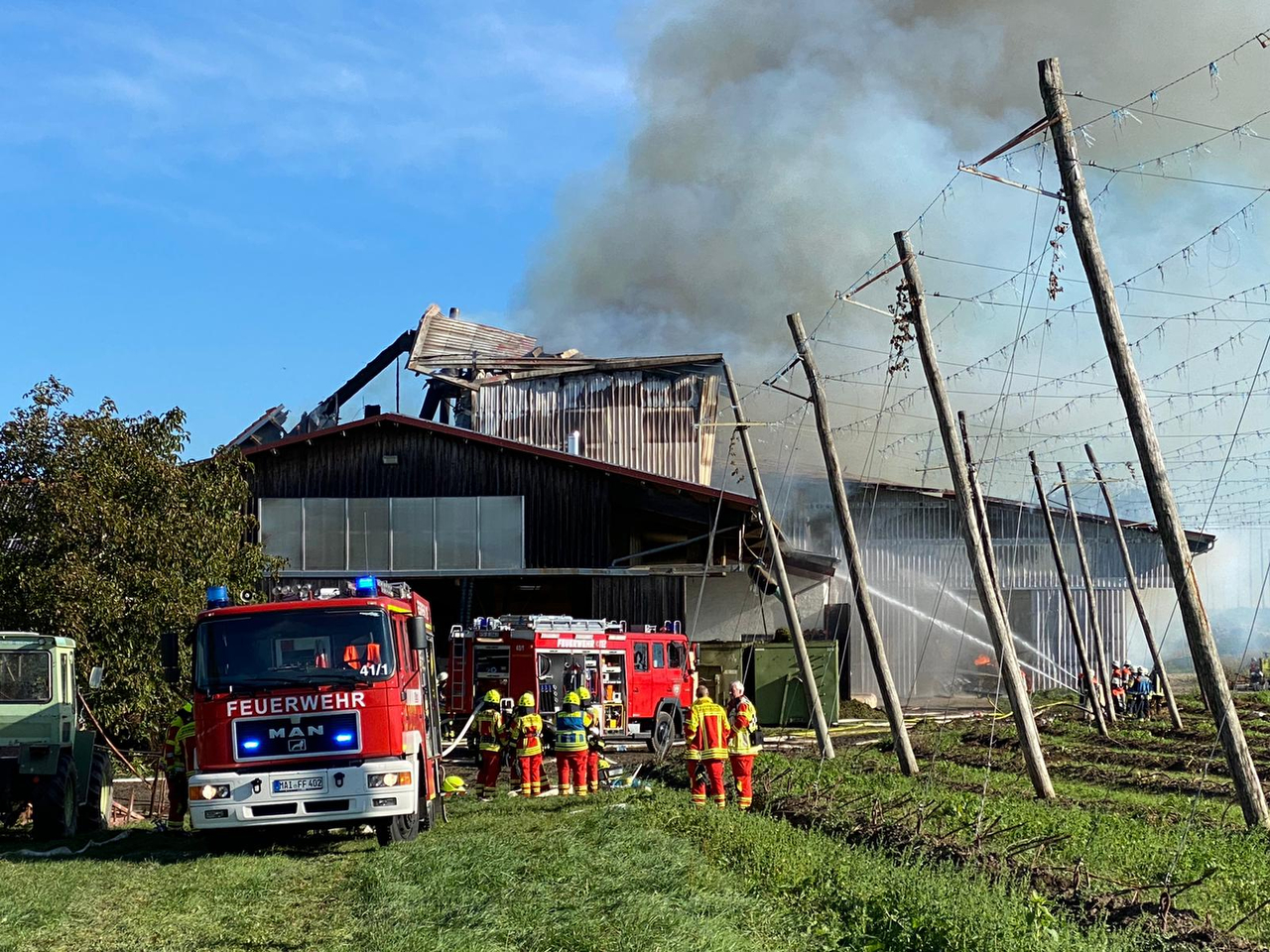 Gegen 8 Uhr waren die Rettungskräfte laut Schilderung des Polizeipräsidiums Oberbayern-Nord heute zu dem freistehenden Anwesen des Hopfenbau-Betriebs im Gemeinde-Gebiet alarmiert worden. "Nach ersten Erkenntnissen war aus bislang unbekannter Ursache ein Feuer im Bereich der Hopfen-Trocknungs-Anlage ausgebrochen", heißt es von der Polizei. Das Feuer habe sich anschließend über eine große Halle sowie auf weitere Anbauten hin ausgebreitet.