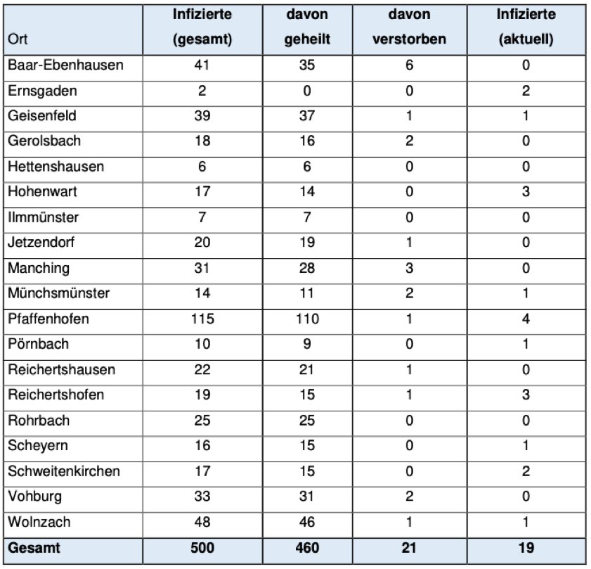 (ty) Im Zusammenhang mit der Corona-Pandemie gibt es im Kreis Pfaffenhofen, wie berichtet, bislang 21 Menschenleben zu beklagen. Das Landratsamt veröffentlicht seit einiger Zeit eine tägliche Übersicht (siehe unten) darüber, in welchen Gemeinden die mit dem Virus infizierten Menschen, die gestorben sind, gelebt haben beziehungsweise wie viele bestätigte Infektionsfälle und genesene Patienten es in welcher Kommune gibt. Die Zahl der Landkreis-Bürger, die positiv auf den neuartigen Erreger getestet worden sind, hat sich seit Freitag um 13 erhöht und beträgt damit jetzt 500.