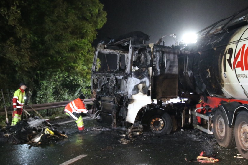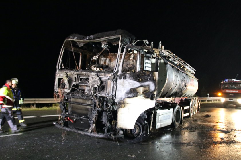 Die Autobahn war zwischen 18.45 Uhr und zirka 19.45 Uhr komplett gesperrt, anschließend konnten zwei Fahrstreifen für den Verkehr wieder frei gegeben werden. Wegen der Bergungs-Arbeiten kam es allerdings bis in die Nacht hinein zu Behinderungen. "Um 23 Uhr konnte die Fahrbahn wieder freigegeben werden", heißt es von der Verkehrspolizei. Die Beamten gehen bezüglich der Brandursache von einem technischen Defekt an der Zugmaschine aus.