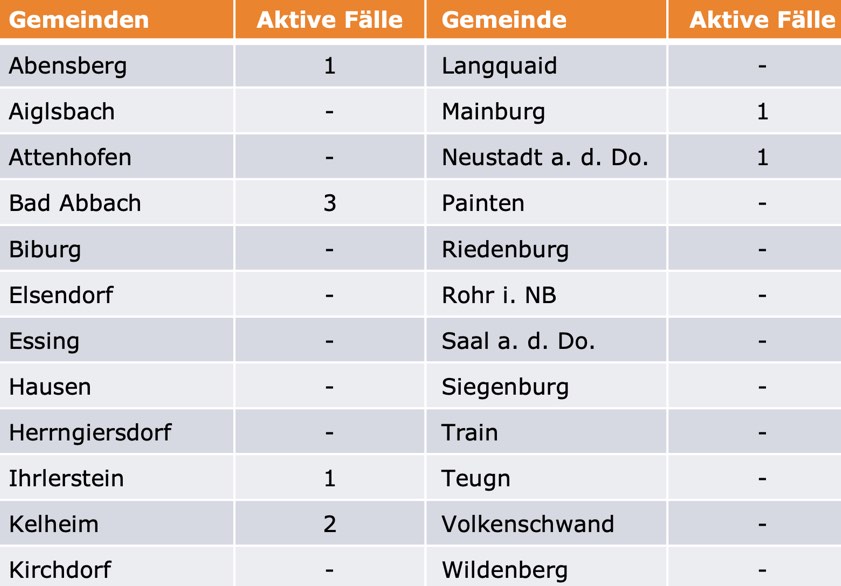 (ty) Im Kreis Kelheim gibt es, wie berichtet, in Zusammenhang mit der Corona-Pandemie bislang 34 Menschenleben zu beklagen. Die Zahl der bestätigten Corona-Fälle hat sich seit der offiziellen Meldung von gestern um einen erhöht. Unter Verweis auf Daten des Gesundheitsamts teilte das Landratsamt heute mit, dass – Stand gestern, 16 Uhr – die Zahl der im Kreis Kelheim positiv auf das neuartige Virus getesteten Menschen bei insgesamt 676 liegt. 633 hiesige Corona-Patienten – zehn mehr als gestern gemeldet – gelten mittlerweile als genesen und sind aus der Quarantäne entlassen. Das bedeutet: Derzeit gibt es neun aktive Corona-Fälle (gestern: 18) im Landkreis. Zahlen aus den Gemeinden zeigt die Tabelle unten.