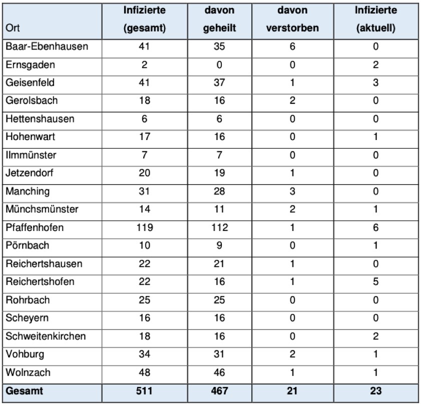 Jeweils wie viele Menschen aus welcher der insgesamt 19 Landkreis-Gemeinden bislang positiv auf das Corona-Virus getestet worden sind, können Sie der tabellarischen Aufstellung in diesem Beitrag entnehmen, die auch heute wieder vom Pfaffenhofener Landratsamt herausgegeben worden ist.