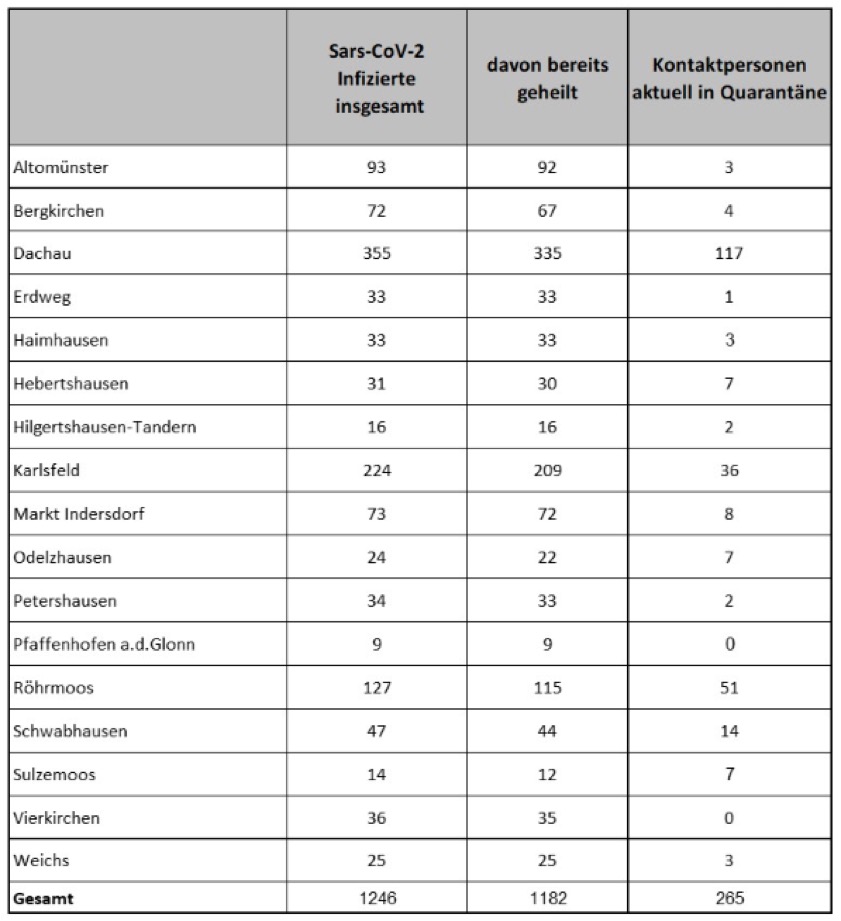 (ty) Die Corona-Situation im Kreis Dachau stellt sich laut aktueller Mitteilung des Landratsamts wie folgt dar: Bis zum heutigen Nachmittag (Stand: 16.30 Uhr) sind insgesamt 1248 Infektions-Fälle im Landkreis registriert worden. 1182 der positiv auf den neuartigen Erreger getesteten Personen gelten mittlerweile als genesen. 36 Landkreis-Bürger, die mit dem Corona-Virus infiziert waren, sind gestorben. Derzeit gibt es im Kreis Dachau 30 aktive Corona-Fälle. Jüngste Zahlen aus sämtlichen Gemeinden gehen aus der unten stehenden Tabelle hervor.