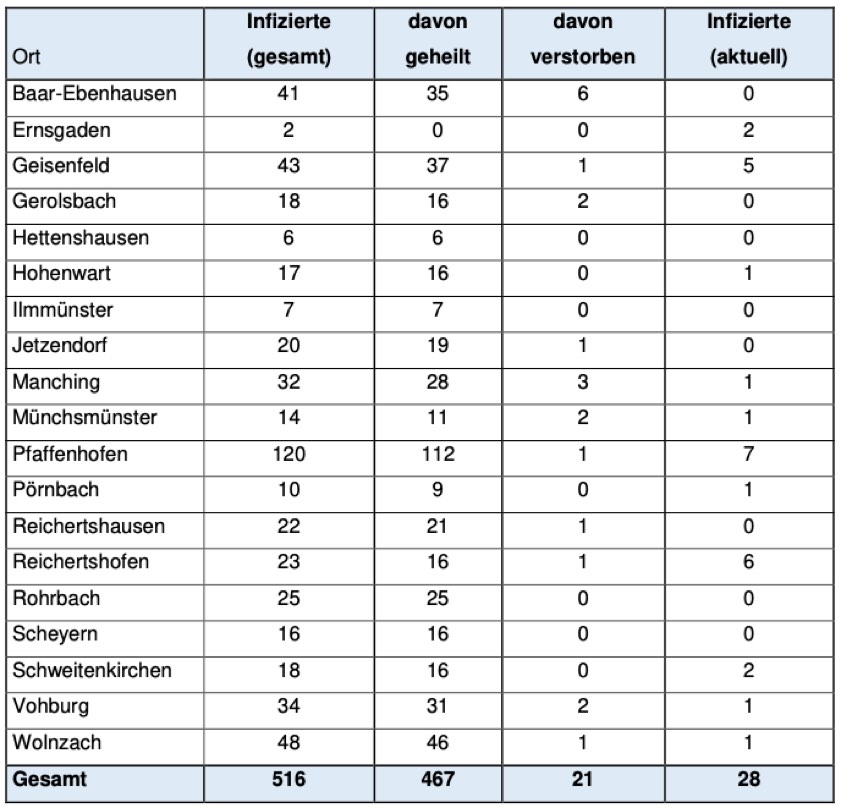 Jeweils wie viele Menschen aus welcher der insgesamt 19 Landkreis-Gemeinden bislang positiv auf das Corona-Virus getestet worden sind, können Sie der tabellarischen Aufstellung in diesem Beitrag entnehmen, die auch heute wieder vom Pfaffenhofener Landratsamt herausgegeben worden ist.