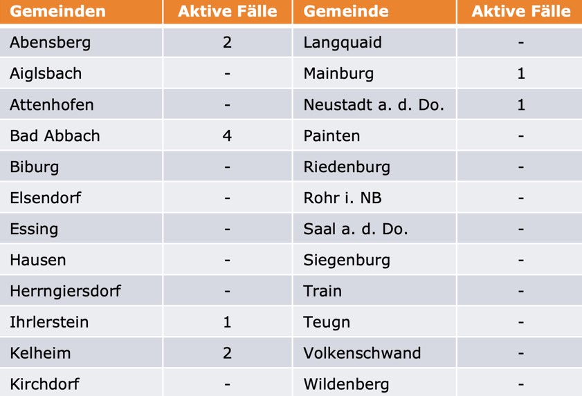 (ty) Im Kreis Kelheim gibt es, wie berichtet, in Zusammenhang mit der Corona-Pandemie bislang 34 Menschenleben zu beklagen. Die Zahl der bestätigten Corona-Fälle hat sich seit der offiziellen Meldung von gestern um zwei erhöht. Unter Verweis auf Daten des Gesundheitsamts teilte das Landratsamt heute mit, dass – Stand gestern, 16 Uhr – die Zahl der im Kreis Kelheim positiv auf das neuartige Virus getesteten Menschen bei insgesamt 678 liegt. 633 hiesige Corona-Patienten – unverändert seit der gestrigen Meldung – gelten mittlerweile als genesen und sind aus der Quarantäne entlassen. Das bedeutet: Derzeit gibt es elf aktive Corona-Fälle (gestern: neun) im Landkreis. Zahlen aus den Gemeinden zeigt die Tabelle unten.