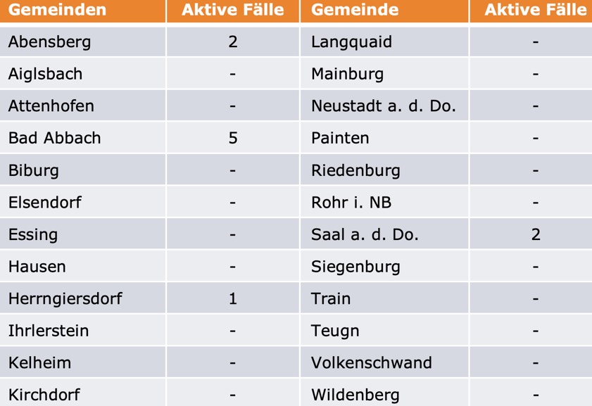 (ty) Im Kreis Kelheim gibt es, wie berichtet, in Zusammenhang mit der Corona-Pandemie bislang 34 Menschenleben zu beklagen. Die Zahl der bestätigten Corona-Fälle hat sich seit der offiziellen Meldung von gestern um zwei erhöht. Unter Verweis auf Daten des Gesundheitsamts teilte das Landratsamt heute mit, dass – Stand gestern, 16 Uhr – die Zahl der im Kreis Kelheim positiv auf das neuartige Virus getesteten Menschen bei insgesamt 683 liegt. 639 hiesige Corona-Patienten – einer mehr als gestern gemeldet – gelten mittlerweile als genesen und sind aus der Quarantäne entlassen. Das bedeutet: Derzeit gibt es zehn aktive Corona-Fälle (gestern: neun) im Landkreis. Zahlen aus den Gemeinden zeigt die Tabelle unten.